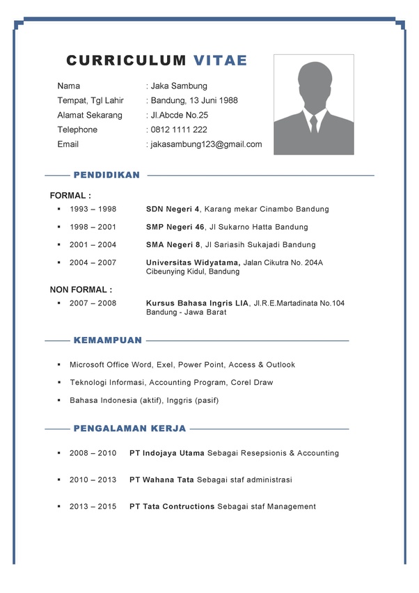 Setelah itu, isi semua data pribadi yang kamu butuhkan, mulai dari nama, profil pribadi, pendidikan, pengalaman kerja dan lain sebagainya. Buat cv / biodata / data diri / desain custom / profil buat yang mau melamar pekerjaan,anda wajib punya cv yang keren & berkelas. Cv ini menjadi sesuatu yang penting dalam melamar kerja, tapi sayangnya tidak semua orang bisa membuat cv yang bagus, terutama di bagian . Tentunya melamar kerja membutuhkan skill dalam membuat cv menjadi secantik. Seorang hrd tidak memiliki waktu yang banyak dalam membaca seluruh cv yang melamar pada pekerjaan, sehingga kamu perlu membuat deskripsi .